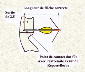 La longueur de flèche correcte est déterminée comme suit : prenez votre allonge avec une flèche trop longue et demandez à quelqu'un de la marquer au moins 2,5 cm en avant du point de contact du fût avec l'extrémité avant du repose-flèche. La longueur de flèche correcte étant ainsi obtenue, vous avez votre allonge. La longueur de la flèche est mesurée depuis le creux de l'encoche jusqu'à l'extrémité du tube. La longueur hors-tout inclue la pointe.