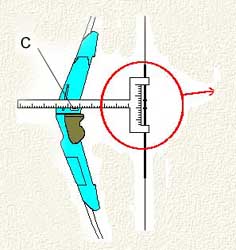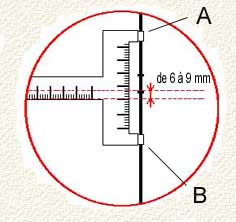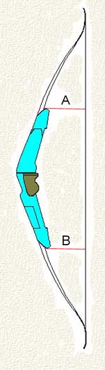 Rôle du tiller Le tiller sert à compenser le fait que l'on tire avec un doigt au-dessus de l'encoche et deux doigts en dessous. Le tiller est le réglage qui permet de synchroniser le départ des branches et de leur arrivée, donnant ainsi un déplacement linéaire du point de poussée de la corde sur la flèche. Mesure du tiller: Avec un réglet prendre la distance entre la base de la branche et la corde. La mesure A (branche du haut) moins la mesure B (branche du bas) doit être comprise entre 0 et 10 mm. Pour débuter un réglage de l'arc, la mesure de 5 ou 6 mm est la plus judicieuse. Le réglage du tiller est une action mécanique. La mesure n'est qu'un outil de vérification de sa stabilité. (A - B ). Il est à noter que, compte tenu de la différence de puissance relative des branches, une fatigue peut se faire à la longue, et un réajustement du tiller sera nécessaire. Attention : Toute modification du tiller => modification du point d'encochage