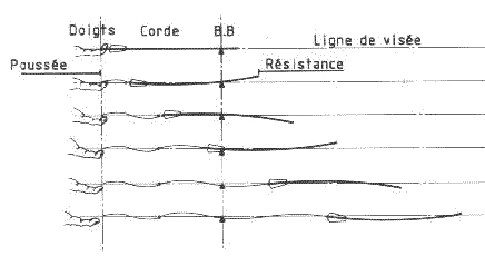 Ces contraintes sont renforcées par le fait qu'au moment ou l'on libère la corde, le simple fait d'ouvrir les doigts déplace la corde de la ligne de visée vers l'intérieure de la fenêtre d'arc.